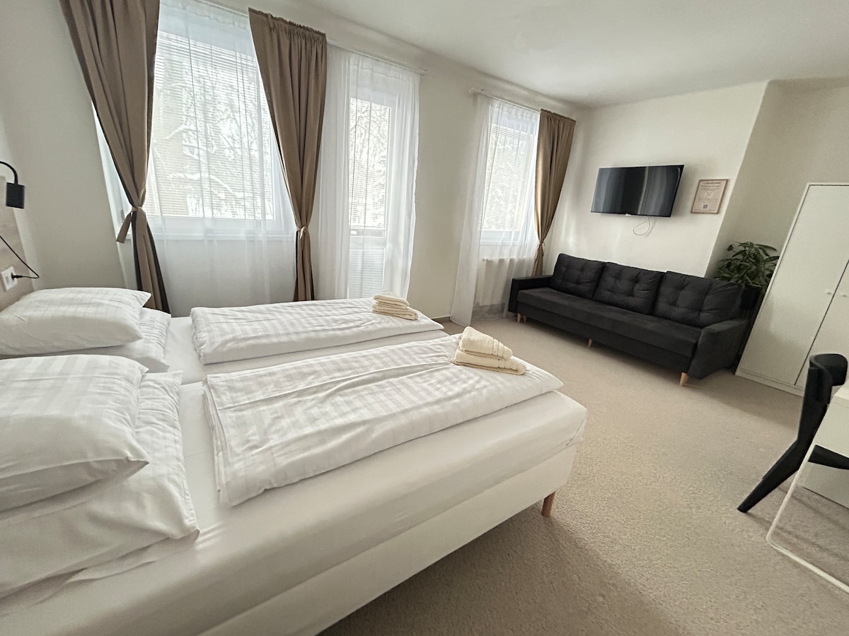 A lovely hotel room with a bathroom and a view of a quiet courtyard. Working desk. Free Wi-Fi. TV. The renovation took place in 2024. Quiet neighborhood within walking distance of historical monuments (800 meters Wenceslas Square). Shops, cafes, cinemas, parks nearby. Please note that city tax 2,2€/pers./night is to be paid upon arrival.
