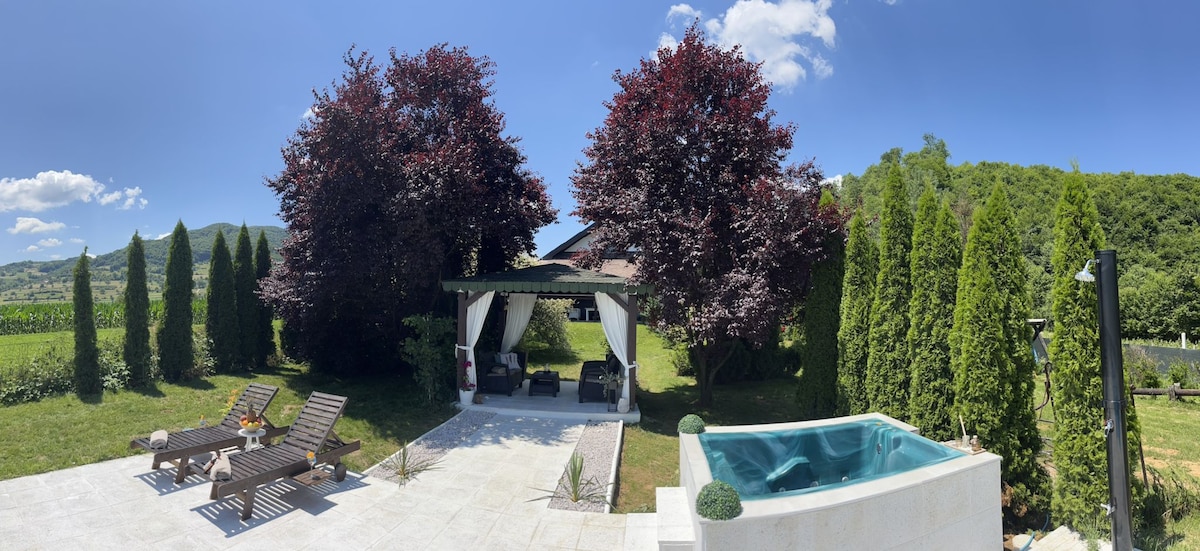 Beautiful weekend-house for friends and family to organize BBQ's, parties and gatherings. With plenty of space (2500 m2) for outdoor activities, a natural well with always cool water and a rich garden full of flowers, fruits and vegetables. The outside dining table offers a beautiful view while enjoying a meal. Very well connected to Sarajevo ( by highway 20 min) and the Piramyds (5 min). Perfect for privacy and relaxation. Come enjoy the full Bosnian experience! 💙💛