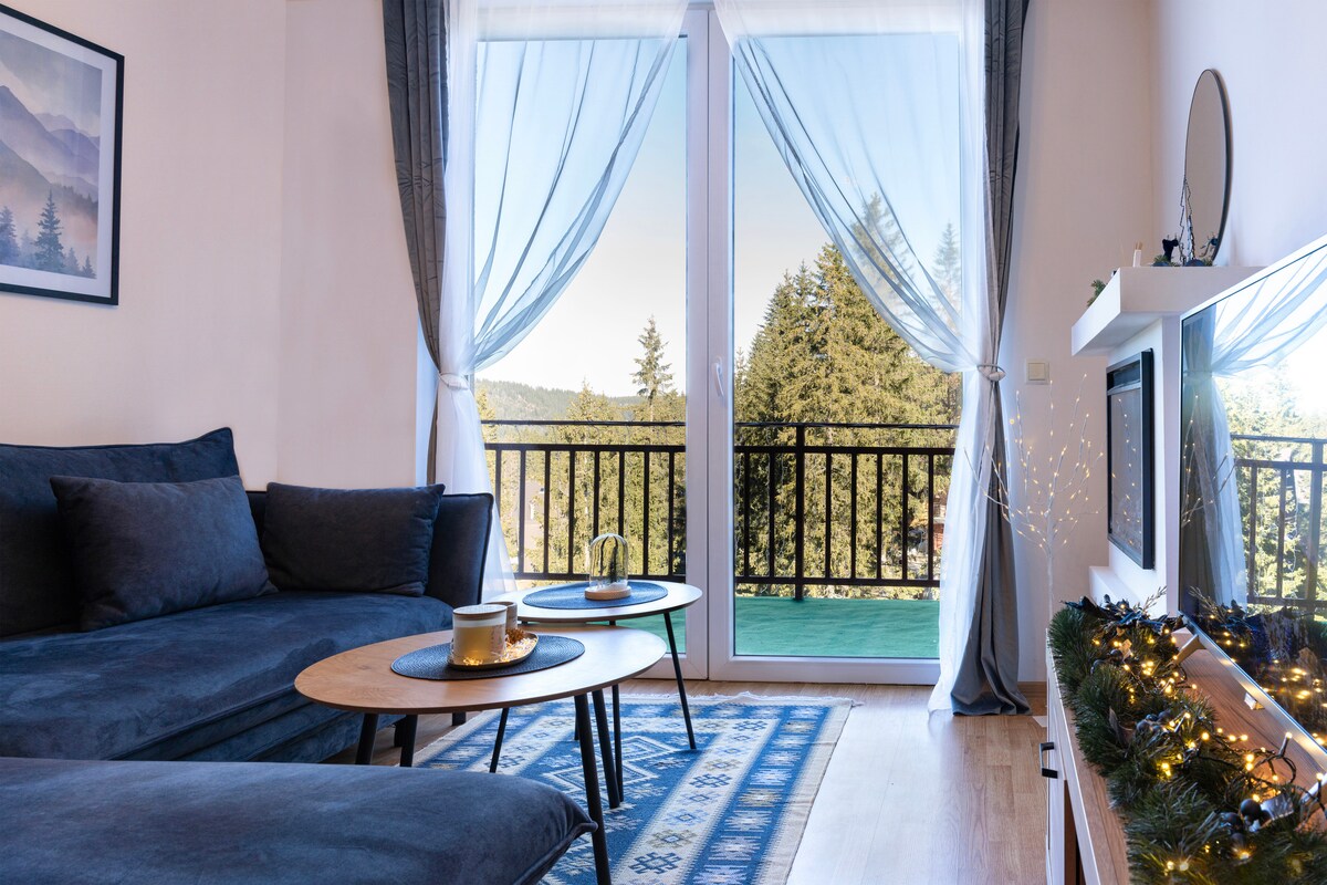 Studio Apartment Blue is a new studio apartment located in the Eco Fis Vlašić complex. In a warm and modern design, this apartment consists of a living room and an open-plan kitchen, a separate sleeping area with a double bed, a hallway, a bathroom and a terrace. A two-seater in the living room also serves as an additional sleeping option. Heating is central, with the possibility of using an electric fireplace, which further contributes to the mountain atmosphere.