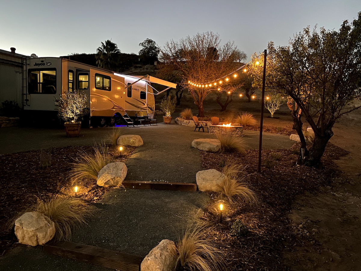 This fully renovated 5th wheel has everything you need, plus No Cleaning Fee! Situated on a hilltop in a quiet foothill neighborhood, you'll have a lovely view of our little valley and mountains. It sports a full kitchen with basics for cooking, RO for purified water, fridge/freezer, coffee maker & , Amazon Fire TV, WIFI, small but well equipped full bathroom, natural latex queen sized bed, AC & heat. Enjoy coffee and fresh eggs, and while you watch the pigs and chickens graze below.