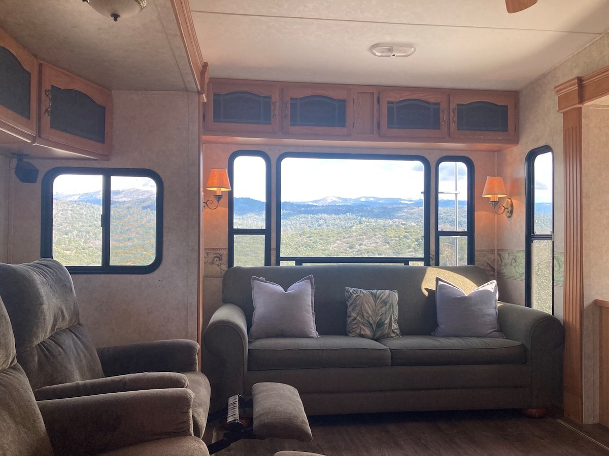 This property is 1 mile up a dirt road. The road can be steep and bumpy in places . We have had over 1200 people up here with no problems. This is just a disclaimer, so you are aware before you book. Bright and roomy newer 34 foot fifth wheel with four slides that sleeps 4 comfortably. Full-size kitchen as well as bbq area. Propane fire pit set up to take in the great views, or stargaze. Quiet and secluded with beautiful views of Lake Isabella. Minutes away from mountains, lake, and river.