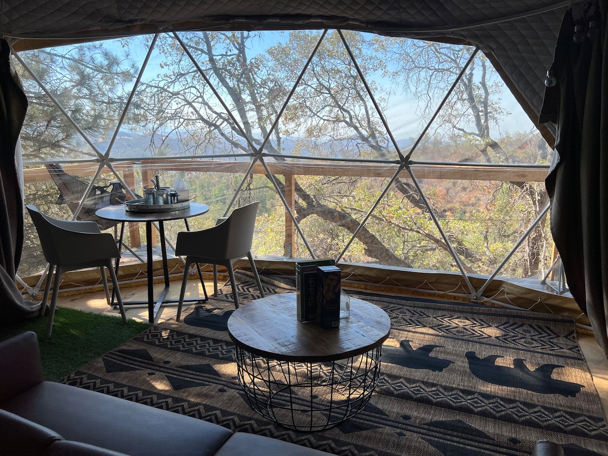 This is not just a stay, it is an experience ! Nestled under a canopy of trees, between ancient rocks, the Dome sits on an elevated deck with breathtaking vistas. The Dome features a panoramic window, providing stunning views. Situated on a 3-acre private property in the center of Three Rivers, California, the Dome offers an ideal location. Features include one queen size bed , a bathroom, a kitchenette with a microwave, small fridge and coffee maker. Wi-Fi and a Smart TV are also included.