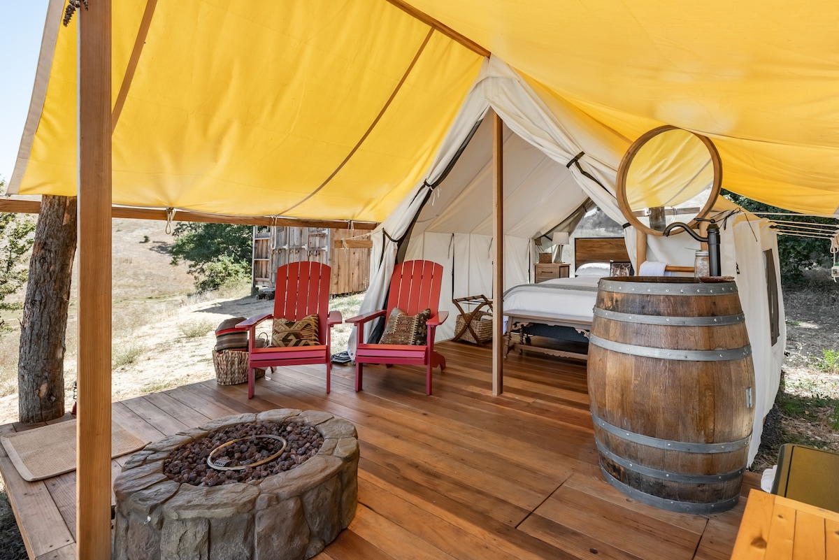 Go eco-friendly glamping in this hillside retreat on a working cattle ranch. The solar-powered luxurious tent features a kitchenette, outdoor shower, private outhouse, covered front porch, and a fire pit. Enjoy expansive views of the valley below. Accessible only by private road, this immersive spot is exclusive, unique and seemingly a world away. Private and rustic, this is glamping at its best! Seasonal: April - Oct.