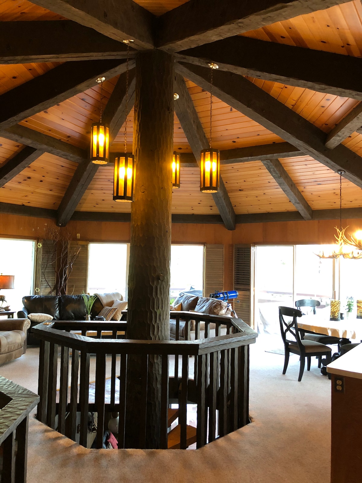 This 2,400 sq ft unique tree house cabin has magical mountain views that will enrich your experience while also providing you peace and tranquillity through a healthy dose of fresh forest air. The open living room and kitchen are the heart of the home. The living room is the perfect place to gather in front of the wood burning fireplace and roast some s’mores with your guests. Propped in the center of the home you are greeted by a large tree which grounds the cabin in the forest.