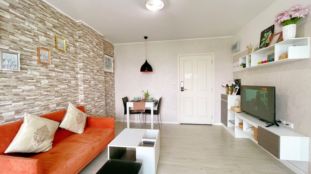 A modern room featuring separate living and sleeping areas, with a comfortable bed suitable for couples or small families. There is also a safety railing for small children's beds, as well as additional foldable beds for special guests. Enjoy the warm living area with bespoke furniture and a dining room, equipped with quality amenities such as a gym, swimming pool, and sauna, creating a resort-like atmosphere. It is located near Central Chiang Mai, the largest shopping mall in the city.