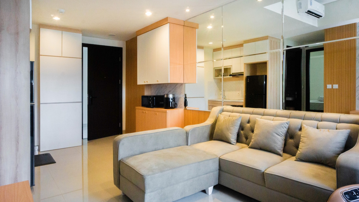This stylish place to stay is perfect for your family or Work trips and Bussines travelers An Hour to Jakarta if the traffic is quite good This apartment is new.. spacious for your whole family to stay! Spacious Bedroom and living room.. Near to District 1 (food corner) and minutes away from major bussines districts.. Available to book for a year or a month