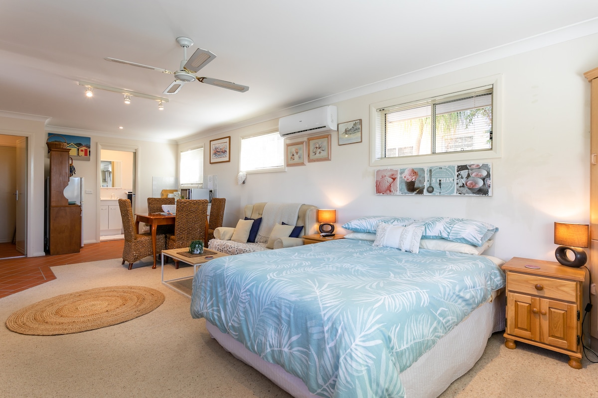 Your own large, private studio, kitchen & deck with your own BBQ, smart TV, full bathroom and kitchen. Large fridge. Near the beach, golf, bike tracks, Nat Park and the famous Coast Track. Air con, wifi, extra outdoor hot shower, friendly hosts, shops & cafes nearby. 1.5 hrs north of Sydney (less if you use North Connex) & 1 hr from Newcastle/Hunter Valley. Hosting for over 11 years on Airbnb and we have been rated as Superhosts for many years.