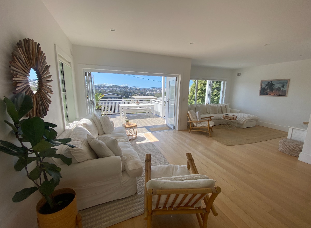 Stunning Brand New Designer Beach House. 2 minute stroll to the sand. Fully fitted out, this elevated, pristine and light-filled family home captures ocean breezes and peaceful vistas. The whole top floor is a tranquil parents' retreat. The main level boasts two queen bedrooms, a bedroom for up to 5 kids, chef's kitchen, bar, family room and second deck w/BBQ. The downstairs garage doubles as a rumpus room with table tennis, bikes, home gym and separate laundry/home office.
