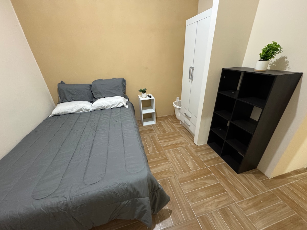 Es un área que cuenta con baño completo, una cocineta con parrilla eléctrica, refigerador de 4.5 pies, horno de microondas, licuadora, cafetera , menaje básico de cocina, mesa para comer, una pequeña sala, televisión con IZZI, Netflix y Amazon , wifi, closet pequeño con ganchos, secadora para el cabello, plancha, acceso independiente. Muy tranquilo y con muchos medios de comunicación. Área cercana para hacer ejercicio al aire libre.
