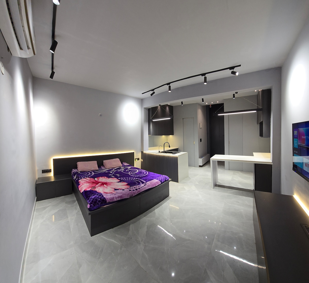 ➽ Spacious 1BHK apartment with an attached patio, fully air-conditioned. All rooms have 1.5-ton ACs. ➽ Sun-facing property in a high-income neighborhood, three-side open, park-facing, and well-ventilated with ample natural light and fresh air. ➽ High-end projector with 25W soundbar and Amazon FireStick with OTT apps. ➽ Fully equipped kitchen with essentials for convenient cooking. ➽ Relax on the stunning private terrace patio with ambient lights and unique Foger system for cooling the patio