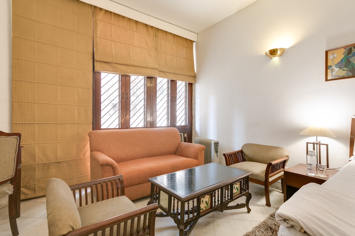 Do you want to bond with family, friends or colleagues in the lap of nature in New Delhi? Do you wish to experience the ideal blend of old-world charm and hospitality with all modern amenities? Do you desire to take a stroll in sprawling lawns under fruit trees or lie in wait for peacocks? If YES then this independent 3-bedroom apartment of Shiv Niwas villa, with private balconies & roof terrace, smart locks, property-wide high-speed Wi-Fi, free car parking & caring lady caretaker-cooks BECKONS!