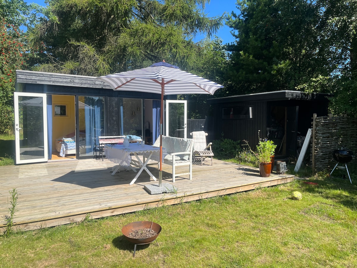 Gæstehus på denne skønne beliggenhed tilbagetrukket fra veje og naboer kan naturen opleves på nærmeste hold med rigt fugle- og dyreliv, som har sin egen indgang, toilet/bad og sauna. Her er en renoveret bygning med synlige bjælker og hems som indbyder til rigtige hyggelige stunder med brændeovn. Gæstehuset ligger op ad den primære bolig hvor jeg selv bor, men privatlivet bliver respekteret. Der kan desværre ikke medtages hund.