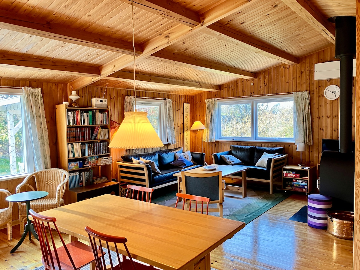 Family friendly summer house with ocean view on large undisturbed property. Perfect for a small getaway in the nature and by the sea. Newly renovated in all wood material and natural colors creating a cozy and homely atmosphere. Room 1: Small double bed (140 cm) Room 2: Two built-in single beds and one junior bed Room 3: Two bunk beds, or convert the lower bunks into a double bed with two single beds on top. You will find the mattress for the double bed stored in the cabins under the beds.