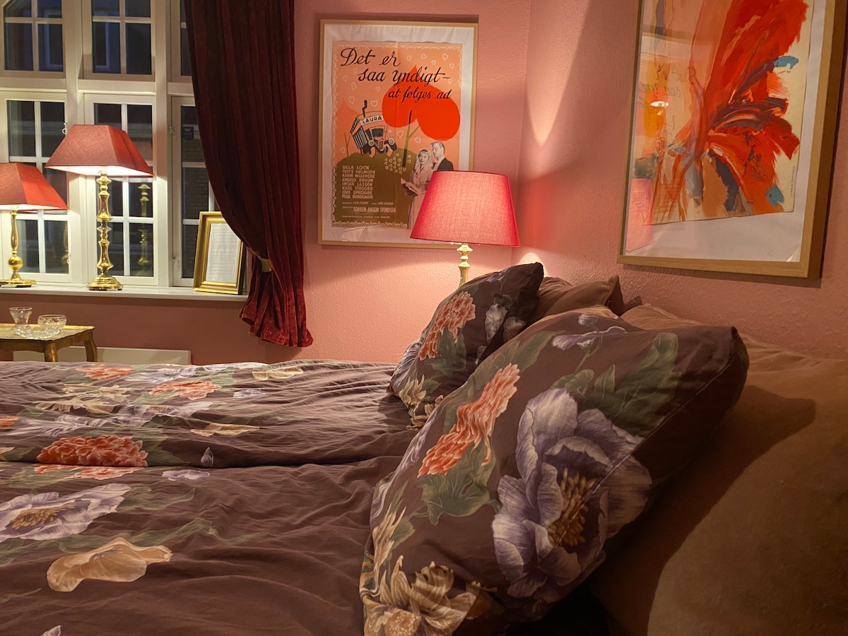 Inspiration af Helle Virkner har formet dette værelse ..de smukke sarte rosa farver kombineret med ‘ dyb rød’ som var hendes politiske parti Helle er kendt fra sine roller som den blide og altid intelligente Elisabeth i i Matador, Olsen Banden, Huset på Kristianshavn m.f Helle Virkner var gift med Danmarks StatsministerJens Otto Krag og de var datidens svar på skønhed og magt