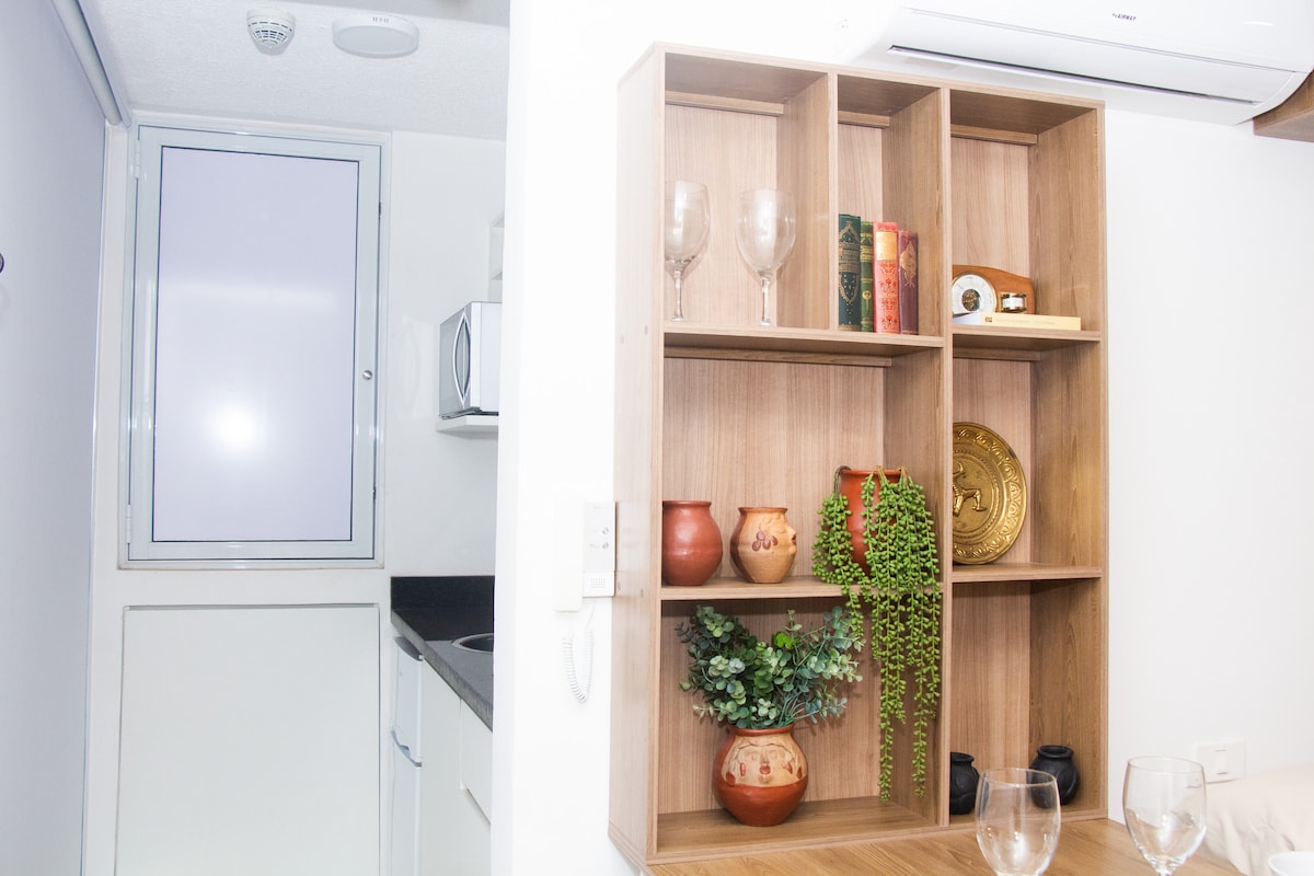 Monoambiente cálidamente decorado con baño privado, pequeño estar con sofá y comedor, placa de cocina, balcón propio. Edificio con guardia 24/7, estacionamiento bajo techo, rodeado de restaurantes, farmacia, tiendas de conveniencia, bares. Smart TV, jabón, toallas,ropa de cama, cocinita, ollas, microondas, A/C split, tendedero de ropa, heladera, cafetera, cubiertos, vasos, secador de pelo, enchufes para USB. Terraza con parrilla bajo pedido, con costo. Alojado en el corazón de Asunción.