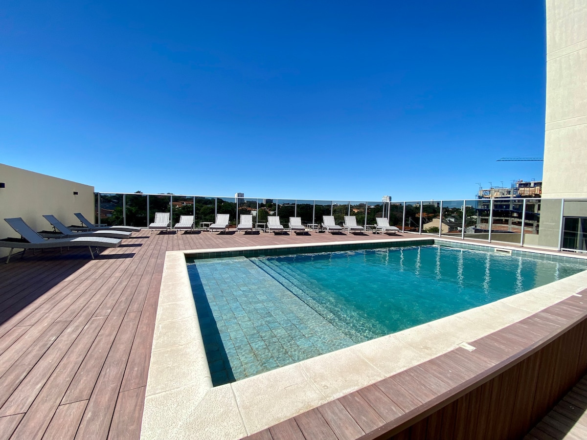 Modern 1BR apartment in prime Asunción location, steps from top shopping centers. Enjoy a full kitchen, and access to amazing building amenities: rooftop pool, gym, movie room, coworking space, and BBQ areas. Designed for short-term stays with 24-hour front desk and a cozy space to relax and feel at home. *This unit has parking inside the building*