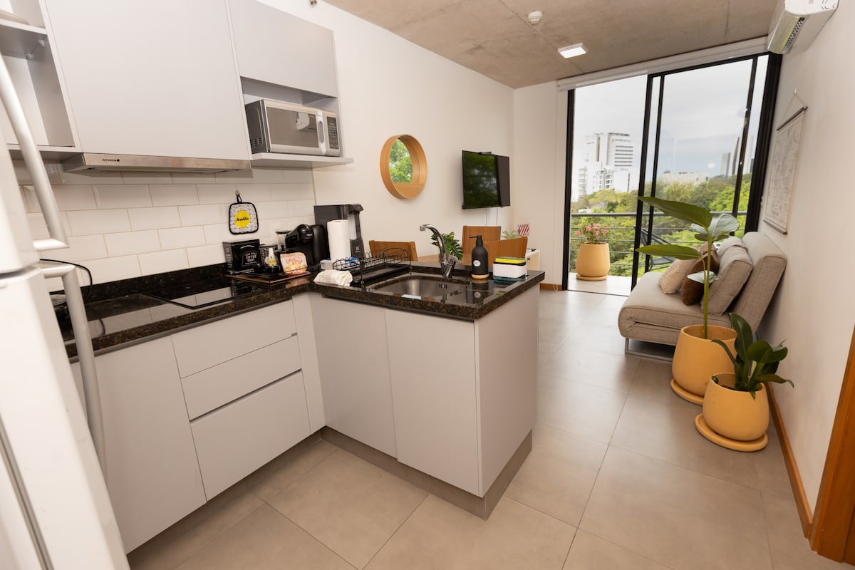 Modern studio apartment in one of the best areas. Half a block from Shopping del Sol, 3 minutes from Paseo La Galería, and 12 minutes from the airport. Easy access to restaurants/supermarkets/offices. Has a Queen bed, Smart TV, air conditioning, WiFi, a fully equipped kitchen, and a private balcony. Access to common areas such as a coworking space, laundry room, pool, gym, sauna, and spa. Parking is not included, but can be rented within the building for USD $10 per day, subject to availability.