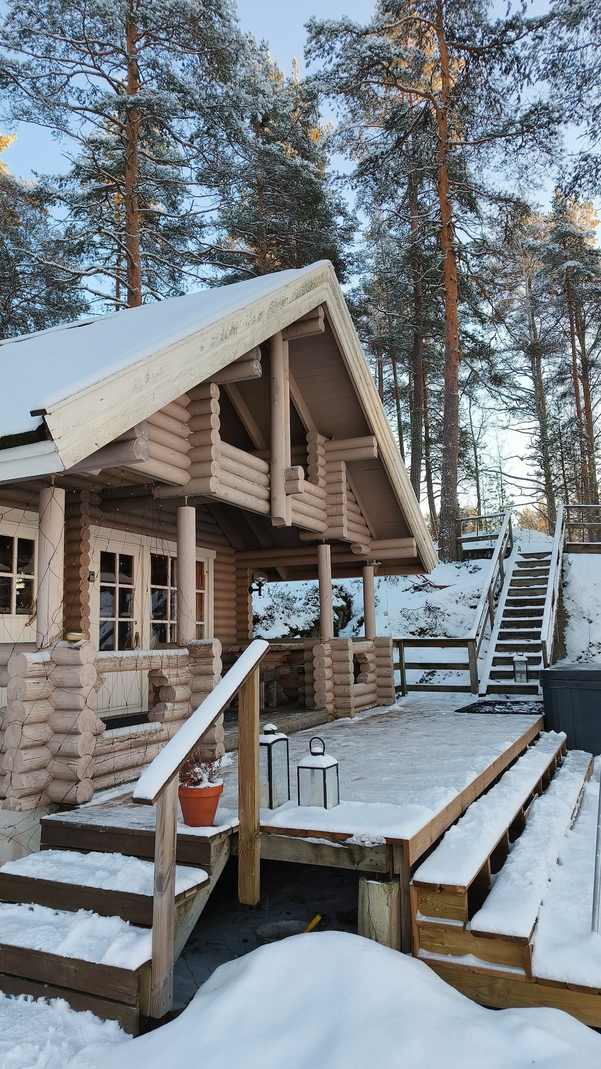 This newly-built guesthouse 2024 with comfortable amenities is located in a the middle of old-growth forests, with a private bay and a calm lake with sunset view. It is a place “to adopt the pace of nature”, with the sound and sight of wild nature. During the winter, a local skiing center with sledding place for kids is open for everyone, about 5km from our place. Also, you can enjoy Sauna, walking in forest, ice-fishing. Relaxing in hot tub in this landscape is truly a unique experience.