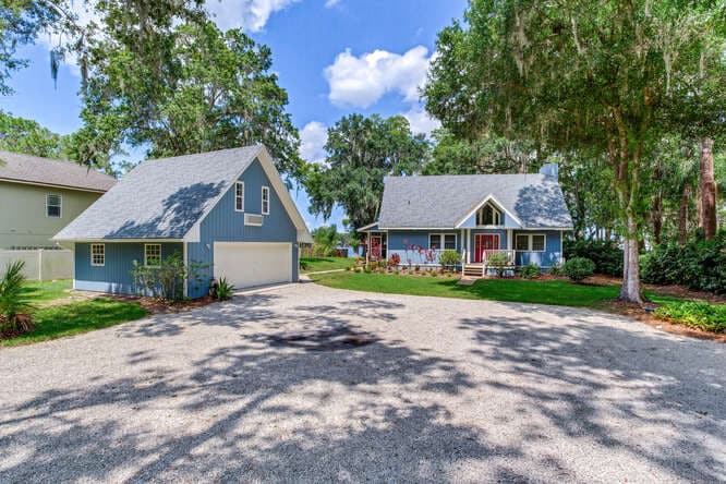 A charming cottage nestled beneath majestic oak trees, combining country living within reach of city amenities. This comfortable space features one bedroom with a king size bed along with built in bunk beds in the main living area. Savor a morning cup of coffee in the screened back porch while enjoying the beautiful tropical foliage. Chickens, goats, cows, and a horse forage nearby. You could possibly be entertained by the goats playing on the roof-tops.