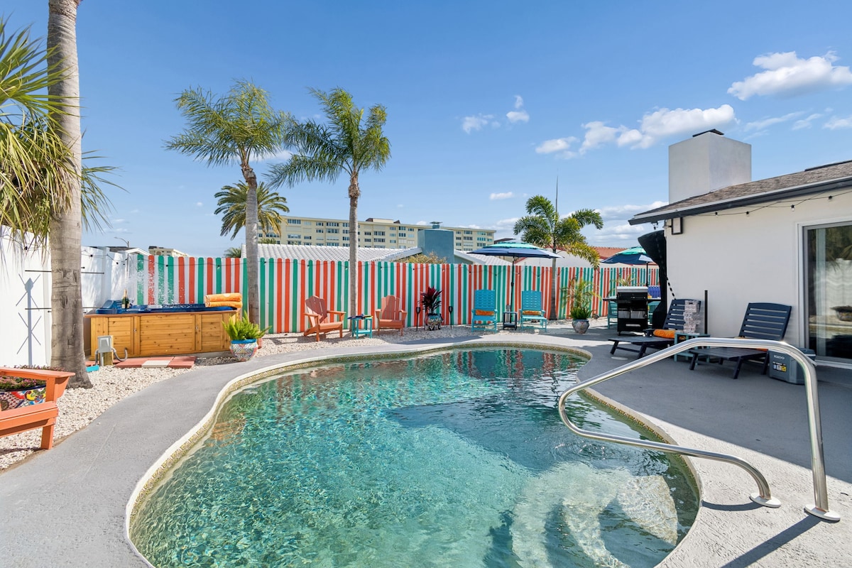 Welcome to Clearwater Hangout- This super unique house was designed to be packed with many amenities. Just 4mi to famous Clearwater Beach! Newly renovated with fresh tiles and quartz counters for a high end trendy design. Inside amenities include- LED vanity, pool tbl/ping pong, wine fridge, dining for 14, and a full transformed game room with a basketball court, Pac-man machine, and a home theatre! Outside is a very private clean space with mini golf, a salt water pool, seating area and firepit