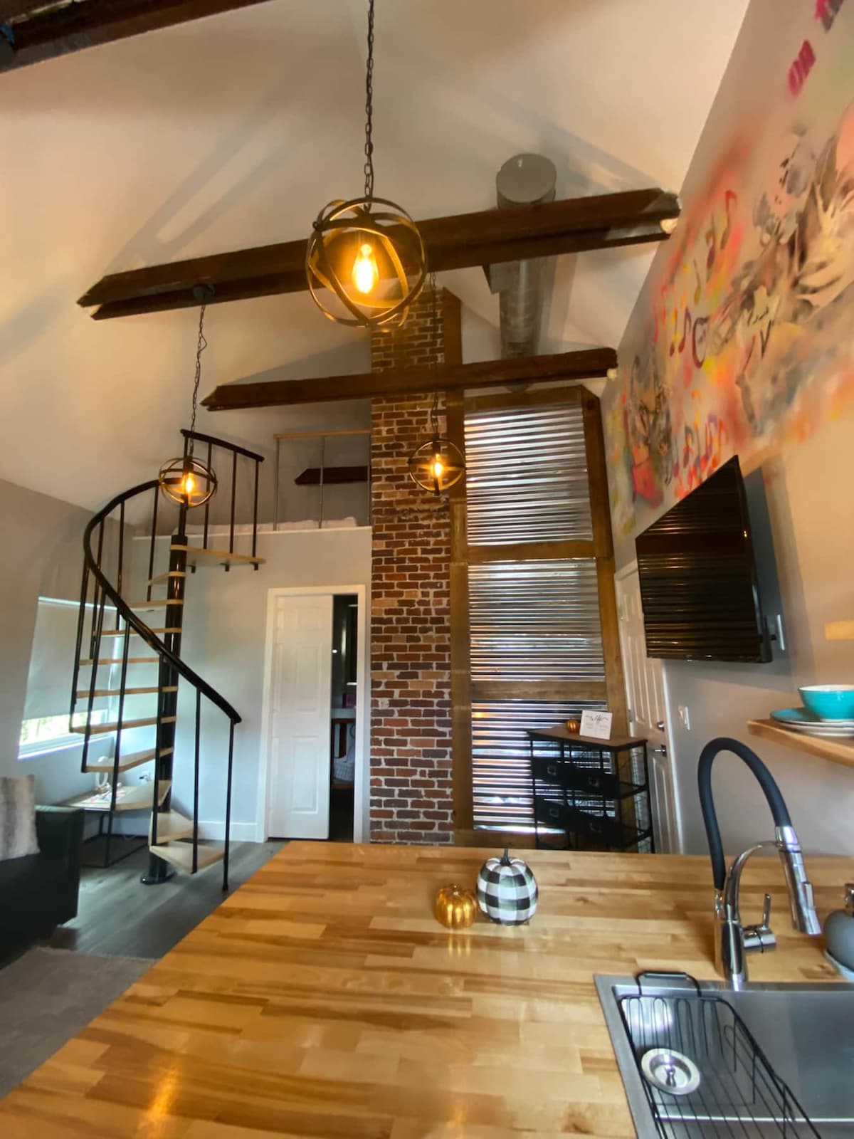 Premier location, steps away from historic downtown and one of the oldest houses in Sanford! • 1 dbl bed, upstairs • We’ve tried to create the most modern design we could imagine while incorporating the original fireplace and taking advantage of the dramatically vaulted ceilings and original beams which date back to 1894, and our love for jazz • Our goal is to exceed your expectations, provide a comfortable feeling like you are at home • you'll see why this is our most popular apt.