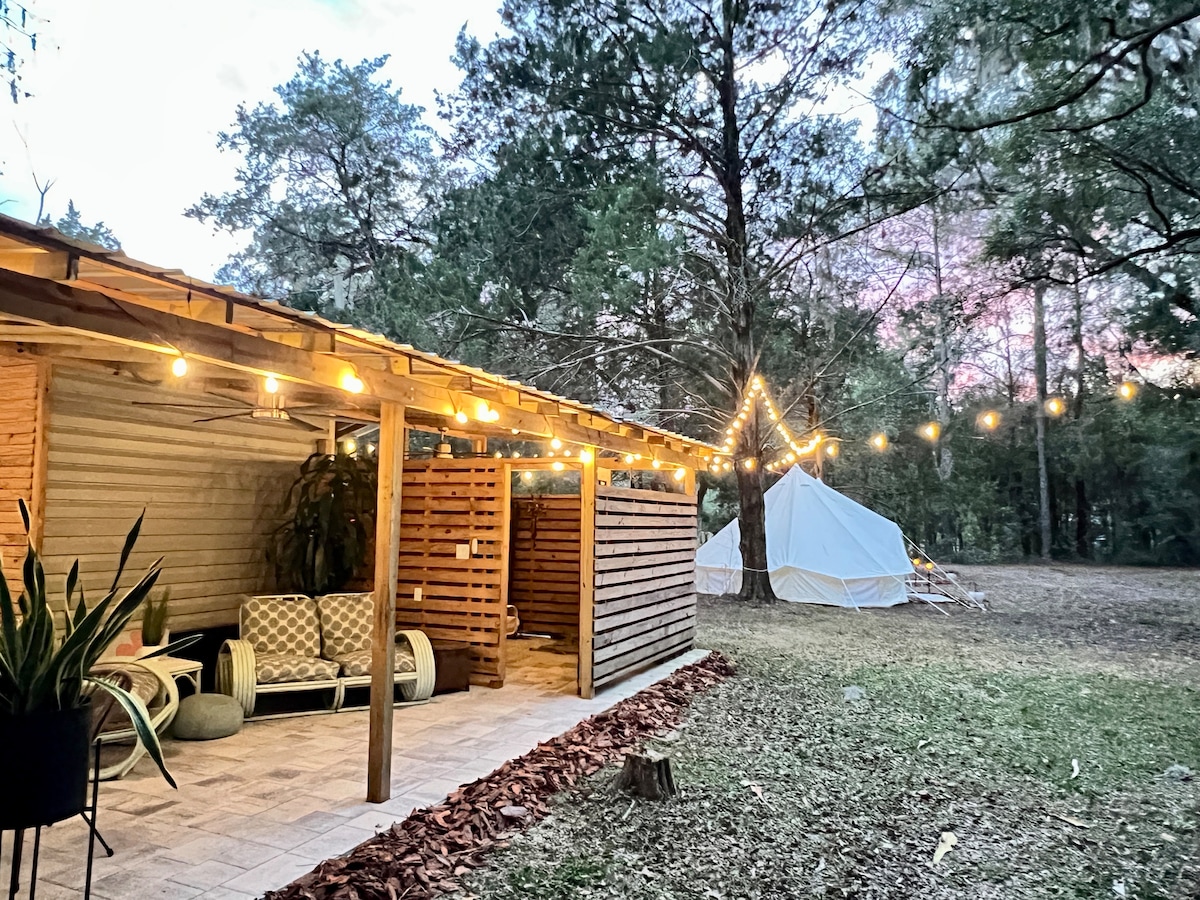 Unwind at Serenity Acres, your private glamping retreat, nestled amidst 10 acres of woods and fields. Enjoy Florida's cooler nights by the fire, and the warm sunny days. Our spacious 20' bell tent offers all the comforts of home, including a plush king-size bed, a cozy seating area, air conditioning, and heat. A full bathroom is located on the property for your personal use only, as tent guests. Shower under the moon with unlimited hot water! Relax at the fire, under the bright country stars!