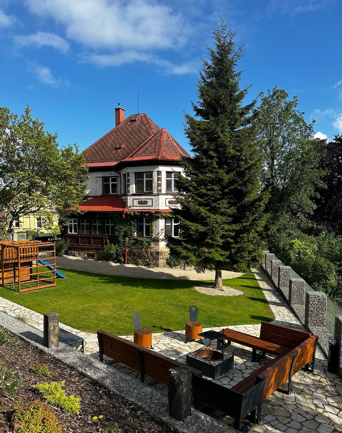 Mamut is a huge and comfortable home in little czech country village, perfect for families and friends who want to spend some quality time together. Mamut is a warm friendly country home with generous common spaces and unique bedrooms. It is designed to enjoy time together, relax in front of the fireplace or hang out in the surrounding garden. Guests especially appreciate the huge table, kids-friendly environment and the BBQ shed.