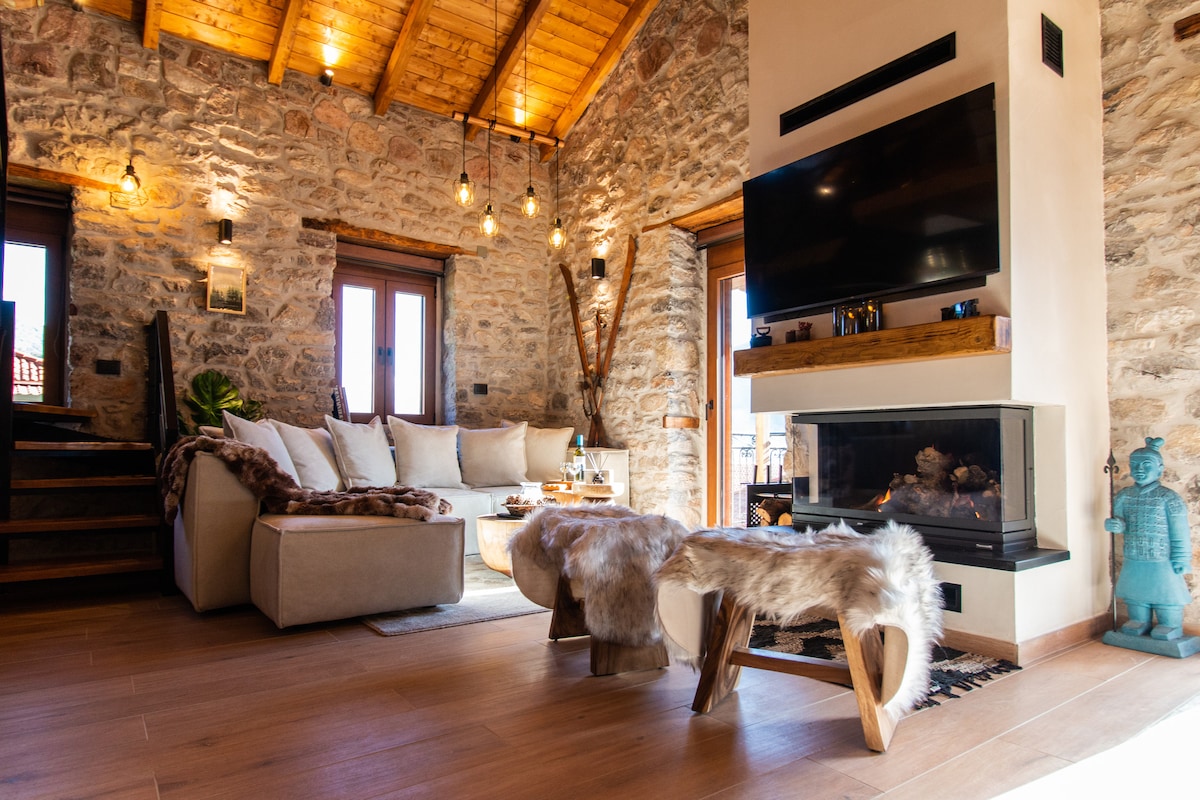 Our villa is spacious & well equipped with one master bedroom , three additional bedrooms, plus a beautiful garret & with two bathrooms. Stone is harmonically combined with wood & classical style while two fireplaces will add a warm feeling to your nights. Every single spot inside the house is a window for the most breathtaking view of the mountain. You will sleep by the burble sound of the rippling flow stream as it travels along the crossing river just outside the house. Pure magic ...