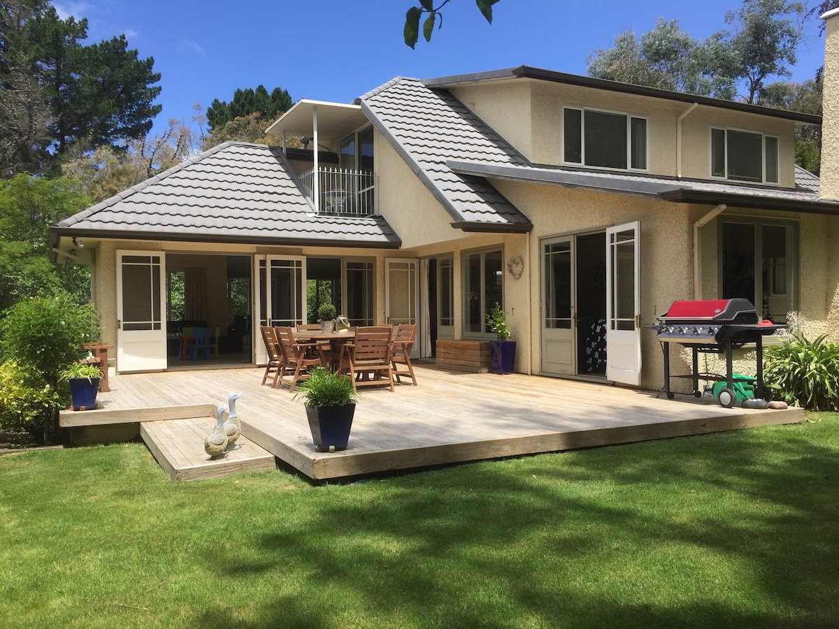 A two level,modern house, decorated in a fresh, slightly funky way, accessed down a Peppertree lined drive. A warm , spacious, inviting home with many entertaining spaces. Perfect for groups or large families. The Lodge is in the Endsleigh hills positioned to the sun and the fabulous views. Set in 3 hectares with 3 other cottages on site. Framed by a large flat lawn with shade trees and many native birds. Surrounded by lifestyle blocks down a no exit Road but only 4 kms from Havelock North
