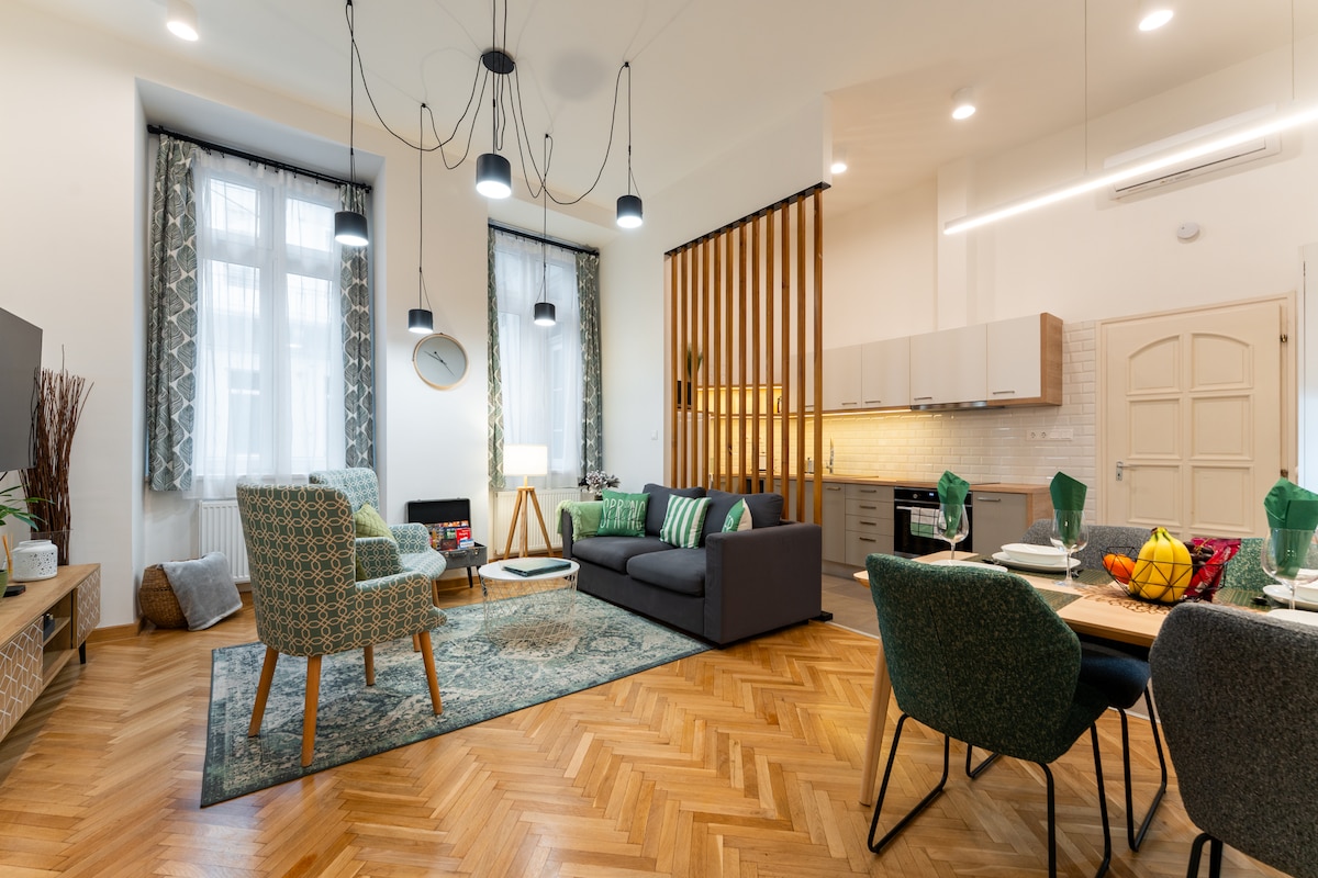 Another gem in our highly popular Architecture Series, again in the Art Deco style, is located in a palatial building in the absolute center. As always, not just aesthetics was in focus, but also the ultimate comfort for up to four people. Two separate bedrooms and two bathrooms with a living area in the locus of the apartment. Many high-end features (including a drier, a rarity in Budapest). Despite the busy location, the apartment is also quiet, ensuring a good night's sleep.