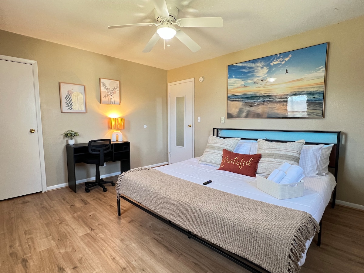 Come experience sleeping in a cave without actually roughing it! Located in the back of the Hobbit, the Cave has its own private entrance under the leaf canopied patio. *Please no smoking of any kind in our home or near the door *($250 fine)* You will be greeted by a lantern hanging among the stalactites and vines and a set of stairs leading down into the cave. An indoor gas fireplace, a 50" smart TV, full kitchen, tiled shower, & queen memory foam mattress all guarantees a magical stay!