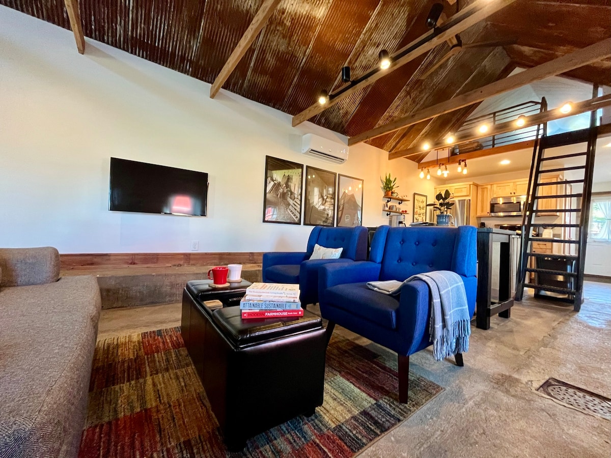 Find peace and restoration in this beautiful barn loft at Perkins' Good Earth Farm. The loft has a bedroom, separate shower and toilet spaces, work area, sitting room, kitchen space, and heating/cooling fresh air system. Located above our farm store, the loft provides privacy for you while giving you access to fresh fruits & veggies, locally sourced meats, homemade soups & salads from our farm kitchen, and so much more. You can also walk our farm trails, visit the veggies, or enjoy a campfire.
