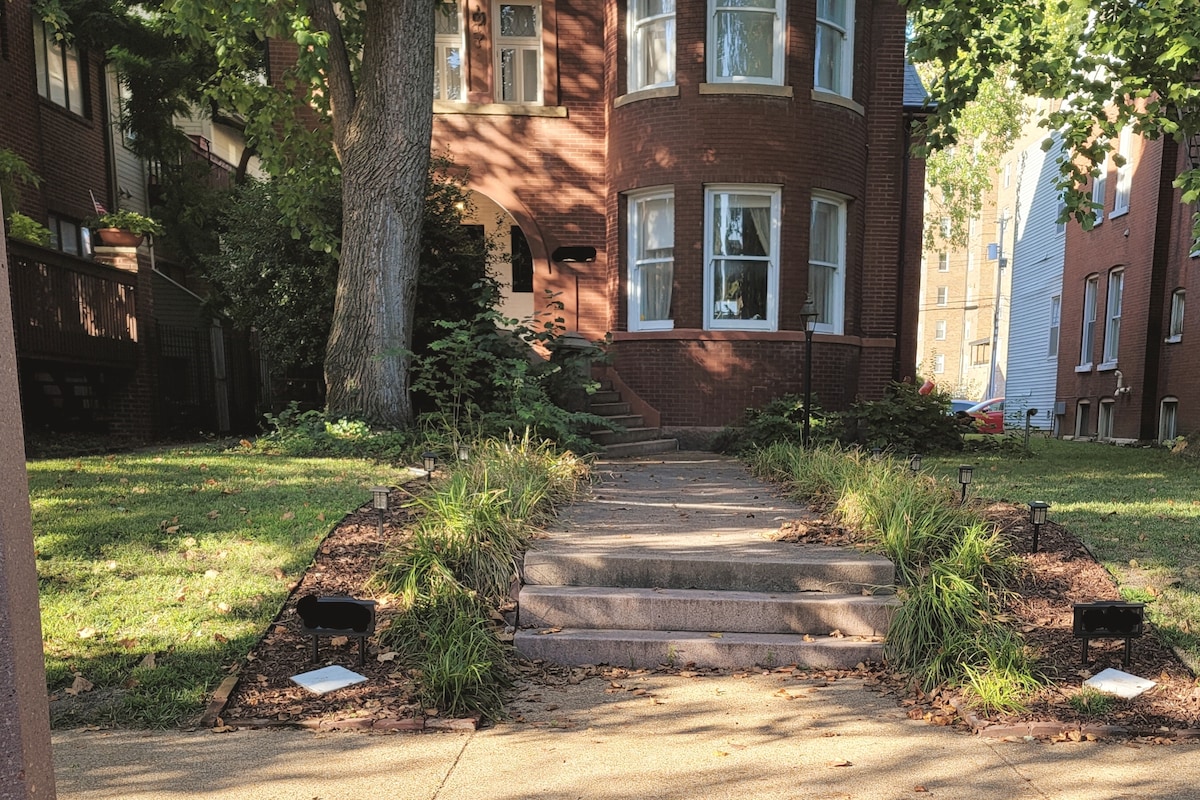 A Lovely room in a historical St. Louis home! The Blue Spruce Room is on the 2nd floor, and has a recently renovated and beautiful bathroom complete with a walk-in rain shower right next to it. The room has a desk, chair, lamp, table, Amazon Fire TV with basically every major streaming App, newly installed hardwood floors, and a Queen sized-bed. The room has two large windows for plenty of natural light with heavy blinds for sleeping in! Full use of the kitchen upstairs is available!