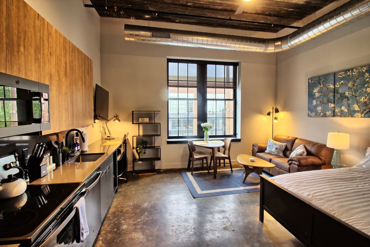 The Nash Loft is a stunning minimalist studio with 12’ ceilings, a fully-equipped kitchen with black stainless appliances and quartz countertops, a spacious walk-in closet, stackable washer + dryer, a designer bathroom with black stainless fixtures and frameless glass shower, and bright 7’ industrial steel-frame windows with views of the tree-lined street and shops below. Situated along the famous Locust Street in the heart of Midtown, you’ll be steps from SLU, Wells Fargo, BJC, and the Grove.