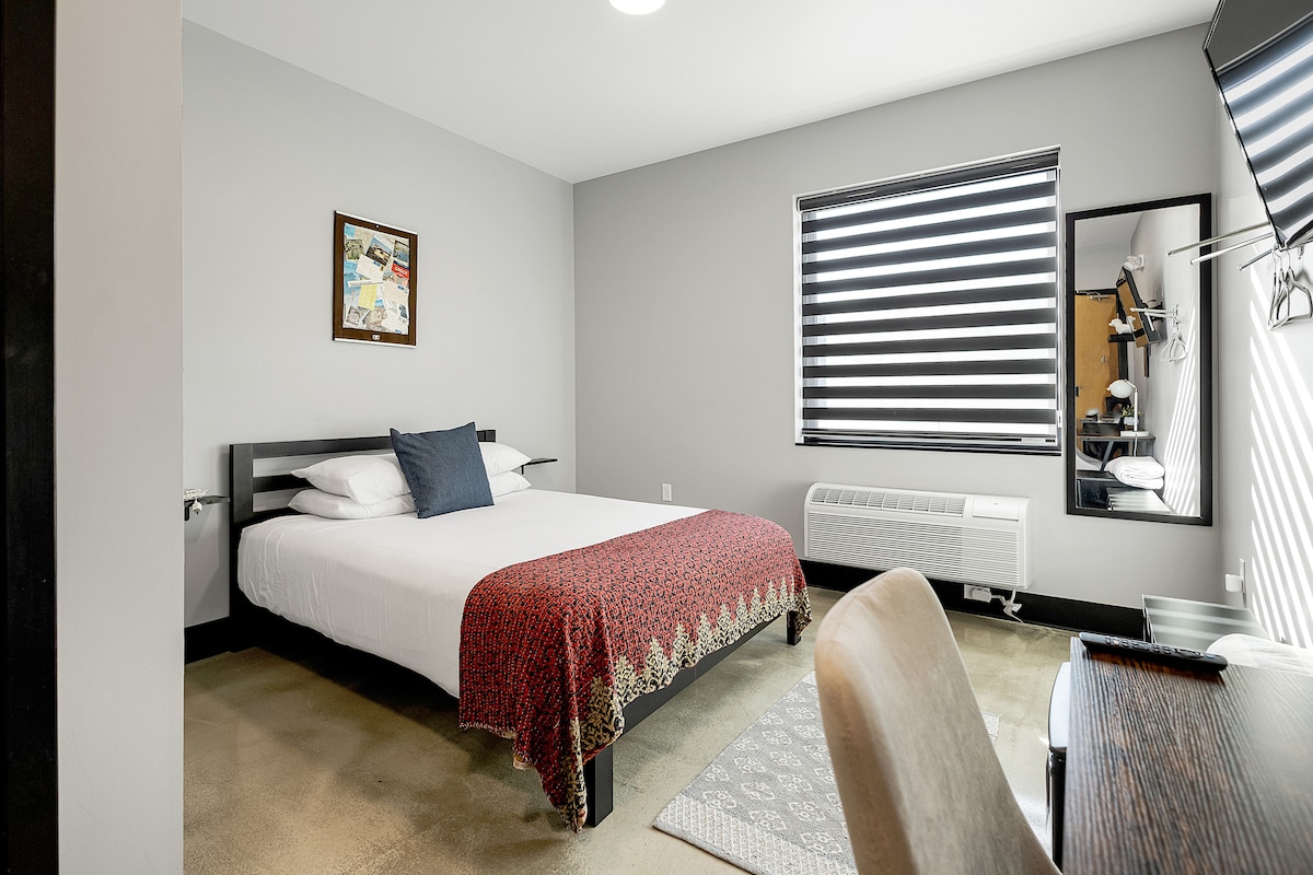 Pilot 1 Room • Located on the second floor, this room is a more affordable option compared to our other rooms. • Features a queen bed and a half bath en suite. • Guests share 2 shower rooms located just outside the room with the 3 other Pilot rooms. • Includes a TV and desk in the room. Additional Amenities • Large community space on the first floor with a kitchen and activities. • Seasonal pool access. Other Rooms • Two Captain rooms on the first floor each have a full private bathroom.