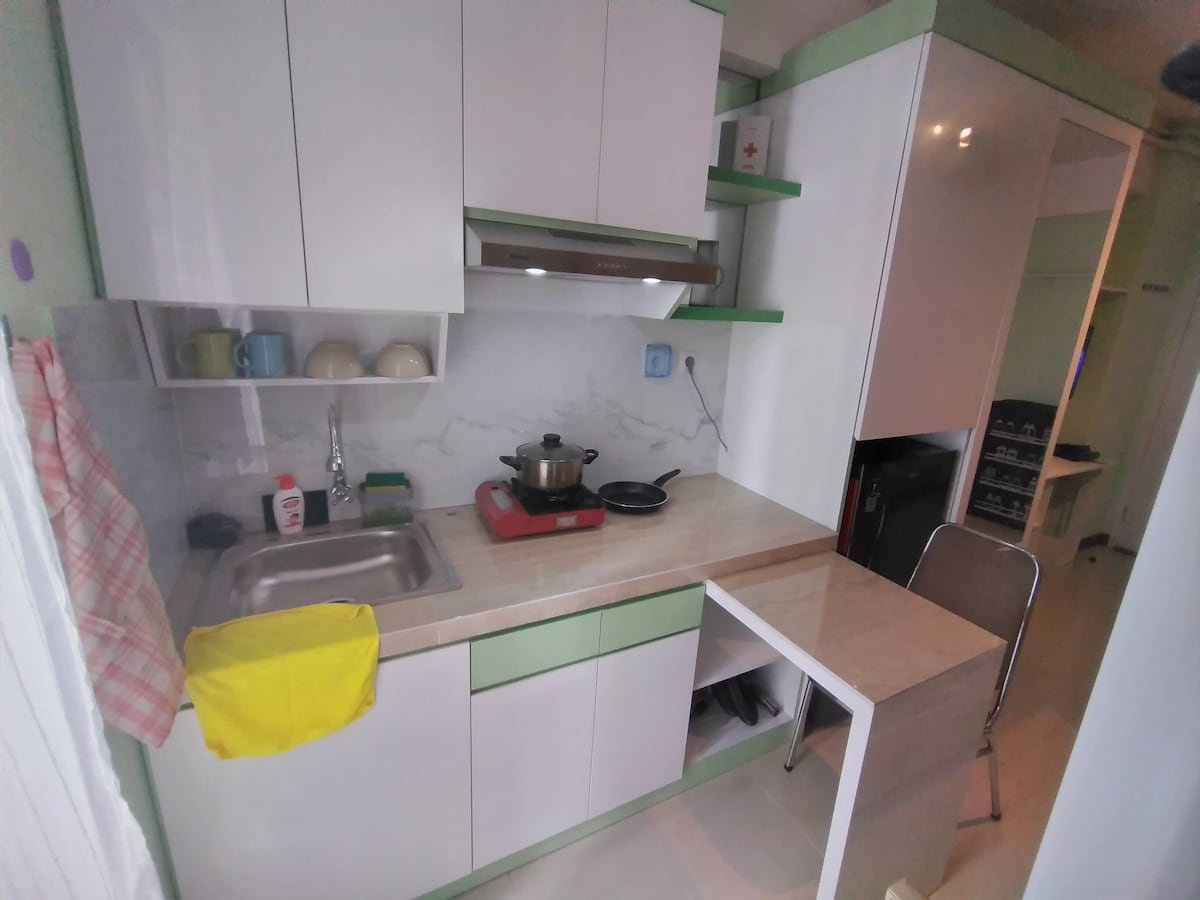 Luxury 2BR with Views at Green Pramuka Experience luxury in this furnished two-bedroom apartment in Central Jakarta , 200m from Green Pramuka Square on Faggio Tower's 27th floor. Amenities: - Nearby shops, parking, and park access. - Family-only; ID required. - Includes cooking utensils, water heater, cleaning supplies, and pool access. Rules: - Switch off devices when leaving. - Gas stove; ensure safety. - Trash 10m away. - No smoking inside or on balcony.