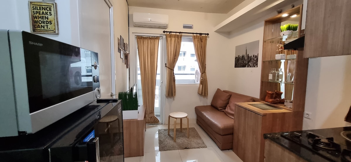 Brand new modern style studio apartement with 50"Samsung Smart Tv Crystal 4K UHD. Located at Tower Fragrant connected to Hublife&Taman Anggrek Mall. -Free Netflix -Free wifi -Free flow mineral water -Dispenser -Electric stove -Mini fridge -Microwave -Hairdryer -Bodywash -Working table Landmarks nearby: 5 Minutes to Central Park Mall, Neo Soho Mall and 10 Minutes to Ciputra Mall. 20 Minutes to Airport.