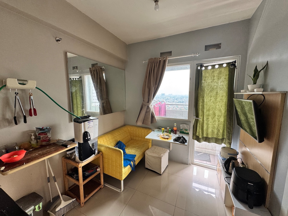 Μοντέρνο στούντιο, με έξυπνη και εργονομική διακόσμηση ώστε να αποδώσει τα μέγιστα ο χώρος! Ο χώρος διαθέτει queen size κρεβάτι και μεγαλο καναπέ. Η κουζίνα είναι πλήρως εξοπλισμένη. Το μπάνιο ανακαινισμενο με παροχή ζεστού νερού κσι νιπτήρα. Παρέχεται πρόσβαση σε τρεις πισίνες,μια μεγάλων διαστάσεων για ενήλικες και δύο μικρότερες για παιδιά, του συγκροτήματος. Επίσης υπάρχει ελεύθερη πρόσβαση στο γυμναστήριο και στη σάουνα στο ισόγειο . Το κέντρο της Τζακάρτα απέχει 5-6klm .