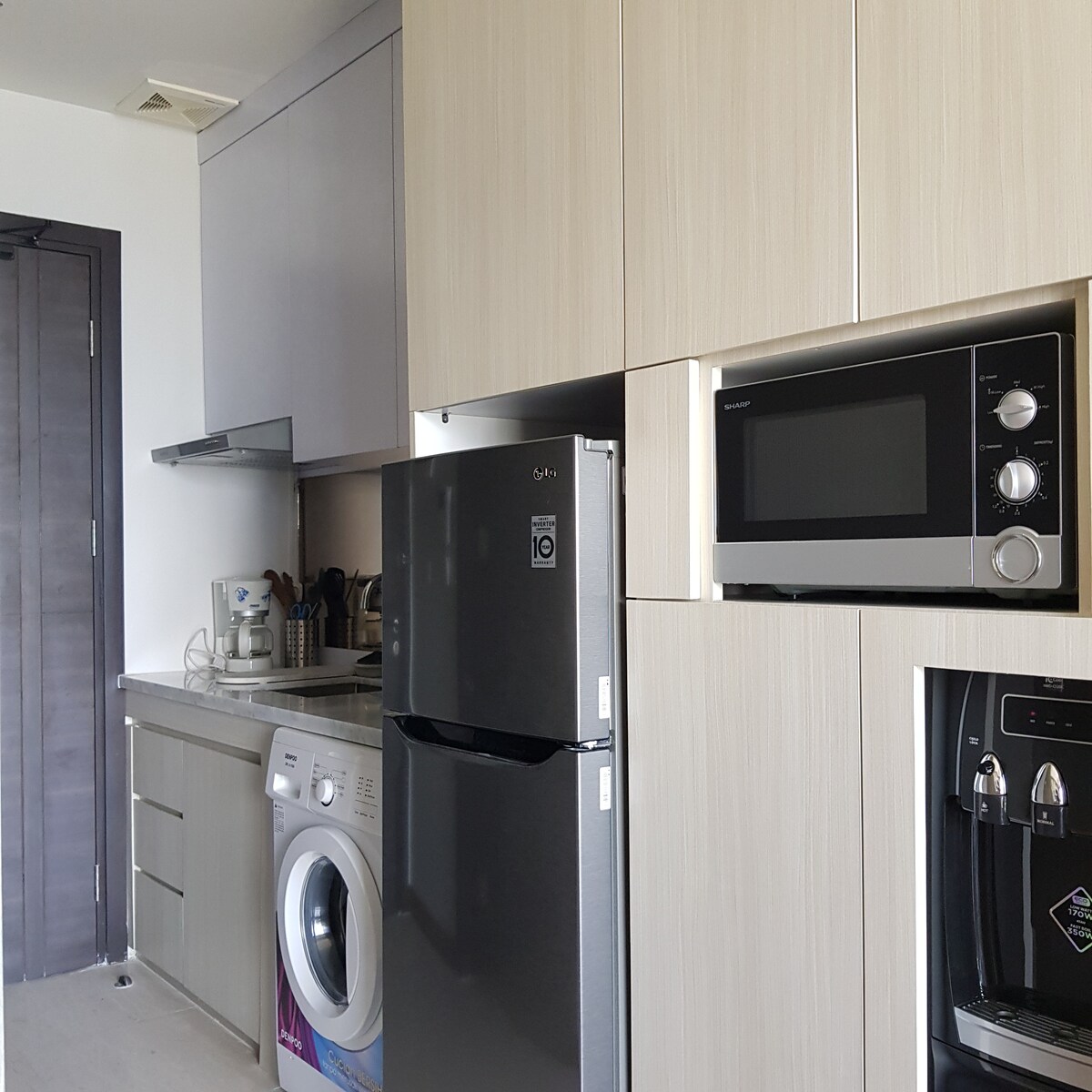 An elegant 24sqm studio in Jakarta's center, blending style and convenience. Includes kitchen, fast Wi-Fi, air-purification, 43" smart TV, sound system and Netflix. It is ideal for various stay types, with contactless access and amenities like pools, jacuzzi, gym, and basketball, Now features a Reverse Osmosis dispenser & food waste disposal, The picture shows a gas stove that has been replaced by an induction cooker (to follow the apartment guidelines for fire hazards)