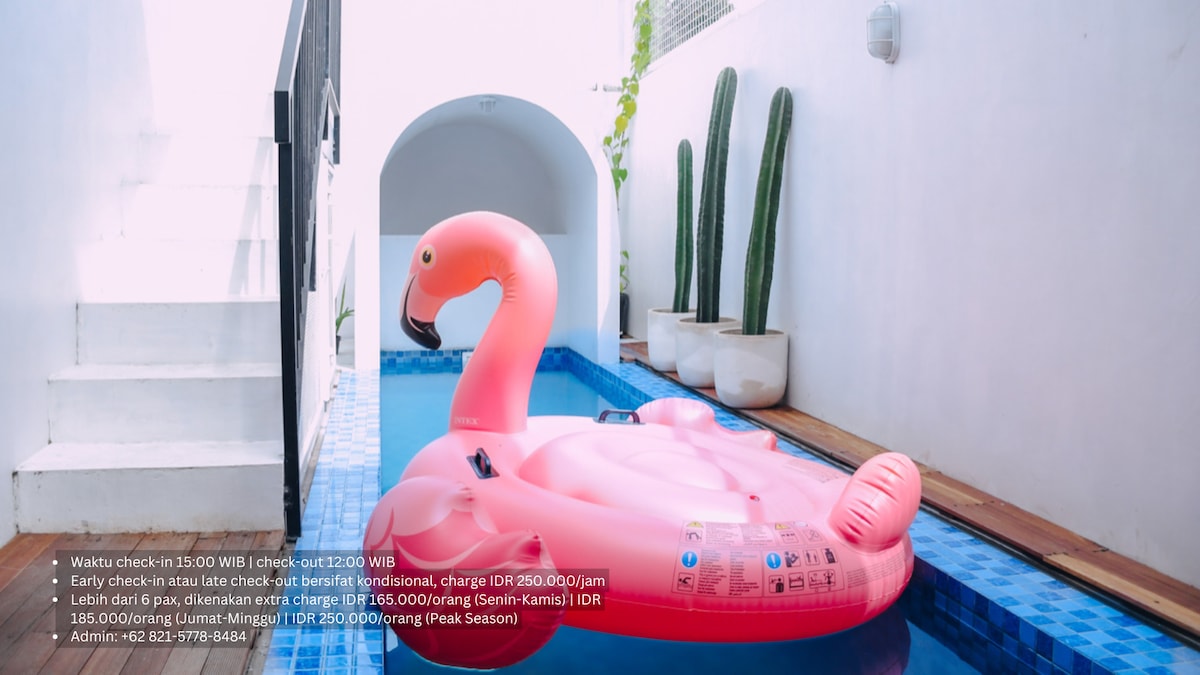 House with 2 bedrooms and private pool in Yogyakarta. Each room has AC. There is 1 bathroom (shower, water heater and bathtub). Suitable for families or groups of 4, couples or individuals There is a kitchen with cooking utensils and cutlery, a refrigerator, dispenser, stove and rice cooker are available. Living room with Smart TV and Netflix access. Free Wi-Fi. There is a mini garden, rooftop and garage for 1 car & 1 in front of the house