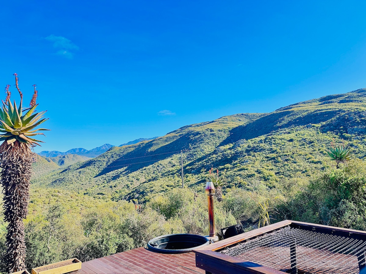 🌵 The Cactus Deck 🌵 *Wood-fire hottub, Fireplace, Elevated chill area on deck, Views Escape to the Karoo and soak up peace and mountain views. Relax in the wood-fired hot tub, gather by the fireplace, or watch the day fade from the sunset deck. Aircon in the bedroom for the hot sunny days. Enjoy a braai or dinner in the indoor dining area. A cozy chilling net for lounging under the open sky which completes this tranquil retreat.