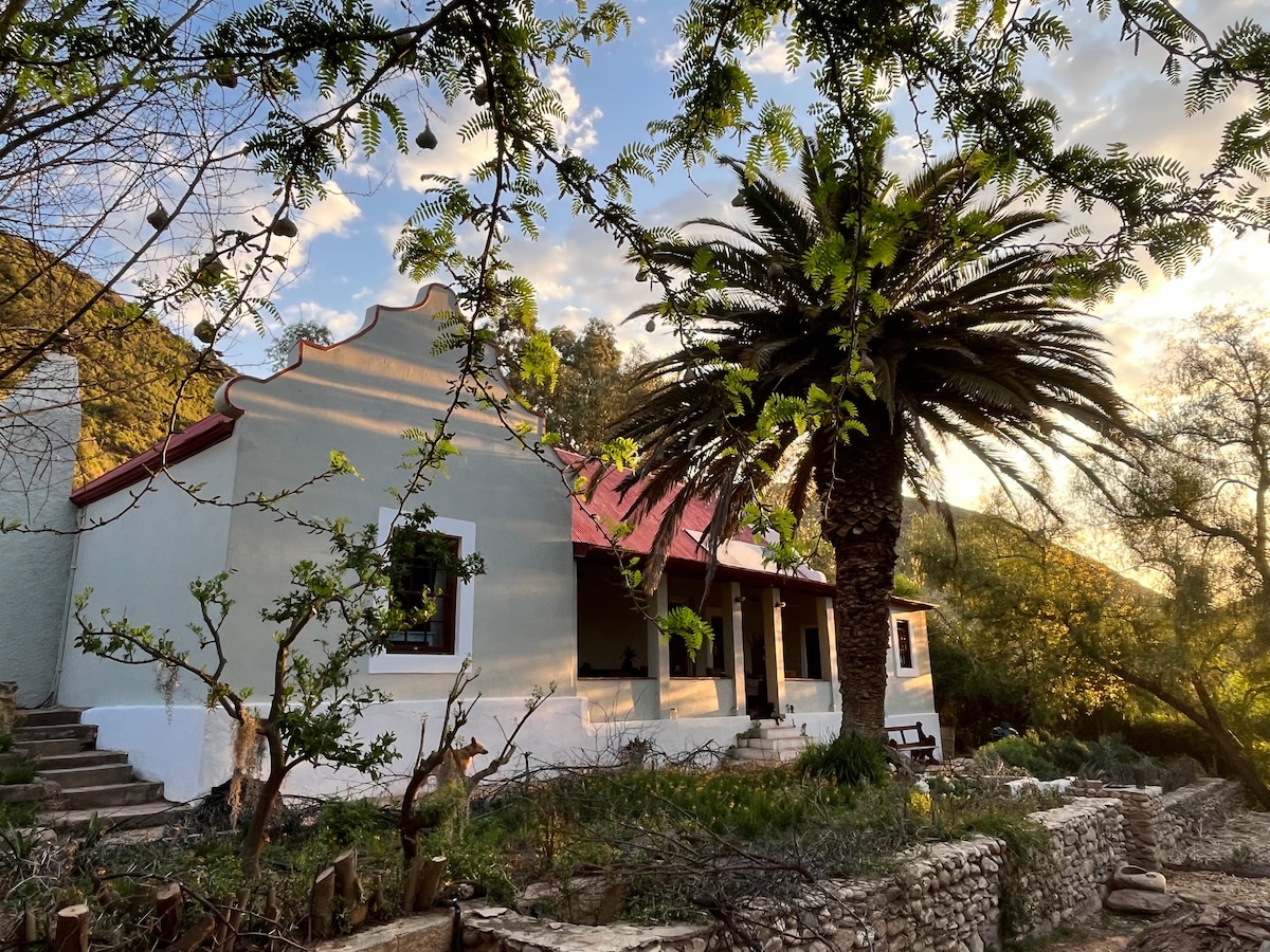 This historic Cape farmhouse has three bedrooms, two bathrooms and is ideal for family getaways and groups of friends looking to settle into a homely environment on a private farm with river swimming, horse riding, hiking, mountain biking, birding and more available on your doorstep. The property is entirely off grid - solar powered electricity and gas water heating make for comfortable living with an almost zero carbon footprint. Dogs are welcome.