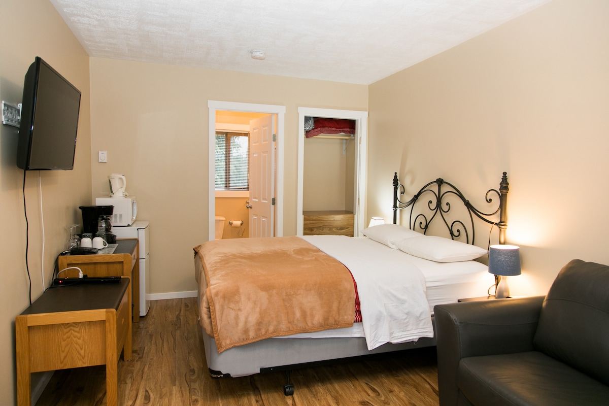 Studio room without kitchen. Has a bed, couch, and private bathroom. Lone Star Motel: your Rossland Basecamp. It isn't a fancy place, but it's clean and affordable. And just steps away from your next adventure.