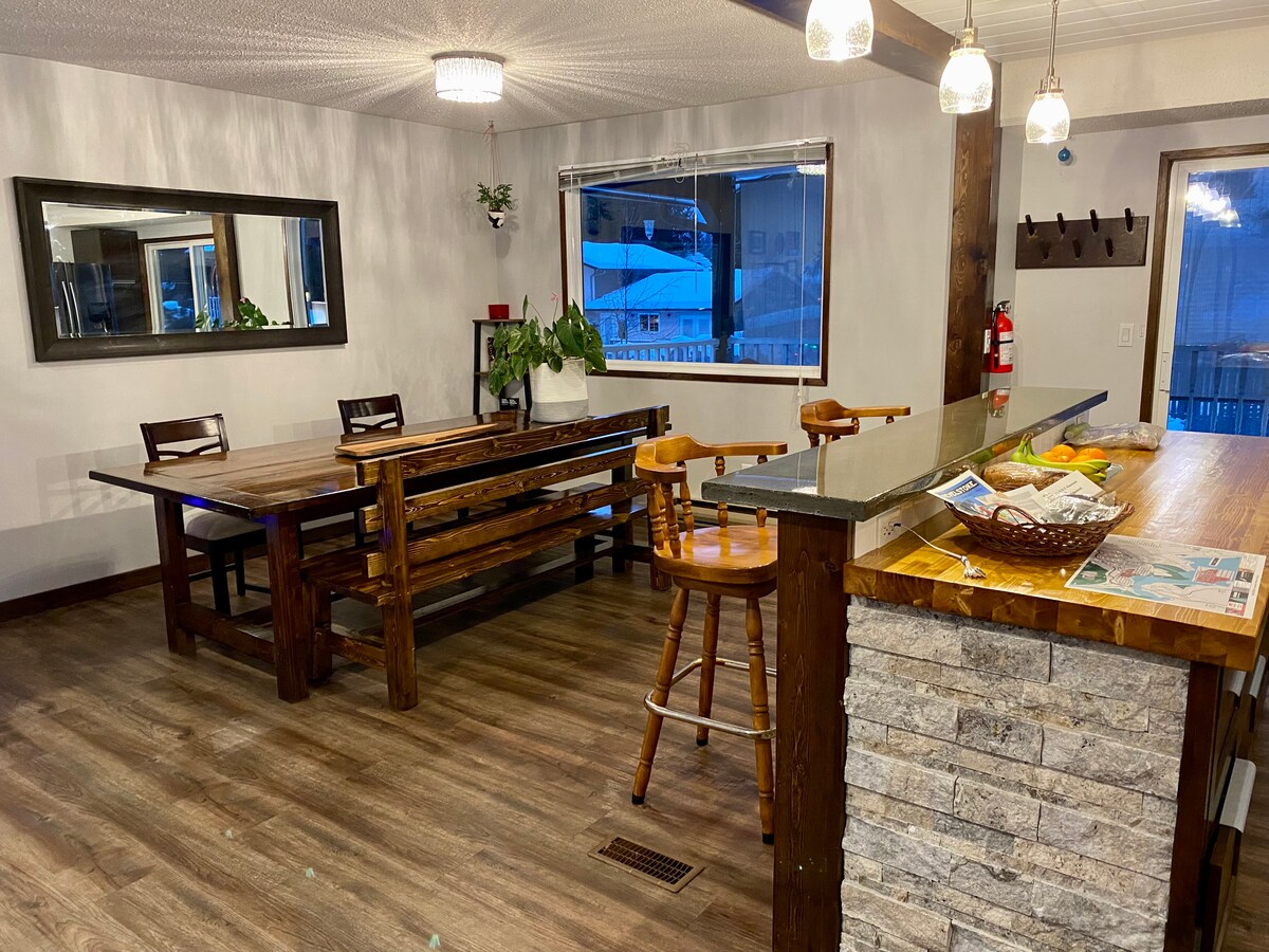 Bring your family and enjoy our spacious mountainside home year round. Located just 2km from Revelstoke Mountain Resort. Space includes 3 bedrooms 1.5 bathrooms on a 1/2 acre. Continental breakfast items stocked for arrival: bananas, orange juice, coffee, coffee cream, bread and homemade jam. Kitchen is well stocked- even a spice drawer for cooking! Features a balcony with bbq, big screen tv, very well stocked kitchen and comfortable beds. Our driveway has space for up to 2 guest vehicles