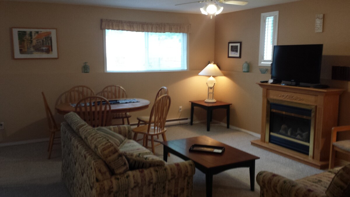 Enjoy a relaxing getaway in the Columbia Valley. This family-friendly condo offers a spacious living room, 2 bedrooms, 2 bathrooms, and dining room. Free above-ground parking. Located just blocks away from main street Radium, golf, dining and shopping are just steps away. A short drive takes you to many more golf courses, hiking, biking, skiing, and shopping. Whether you're looking to enjoy the year-round activities or a peaceful escape, this space has everything you’ll need during your stay.