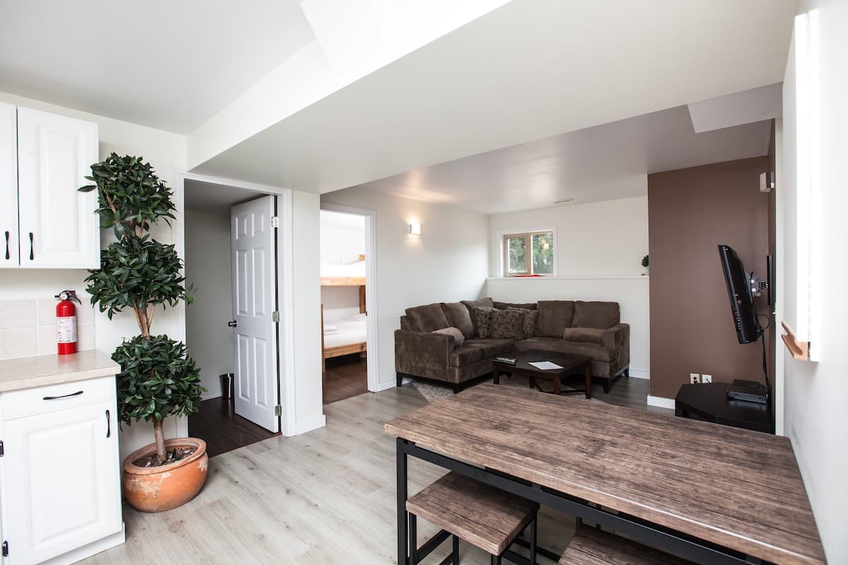 Cozy one bedroom, studio-style coachhouse with a queen bed plus a full-size pullout (fits 3, maybe 4 guests), only 3 blocks from Baker Street! Minutes from Nelson’s finest shops and restaurants lies a tucked away, fully detached, sunny space that has an outdoor patio area with spectacular views. Fitted with AC, kitchen, washer, dryer, shower, and Smart TV - it’s the perfect place for your getaway at any time of year!