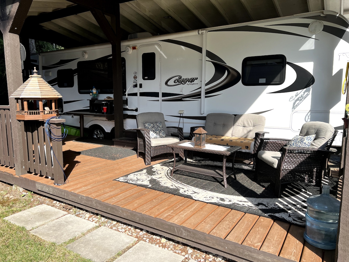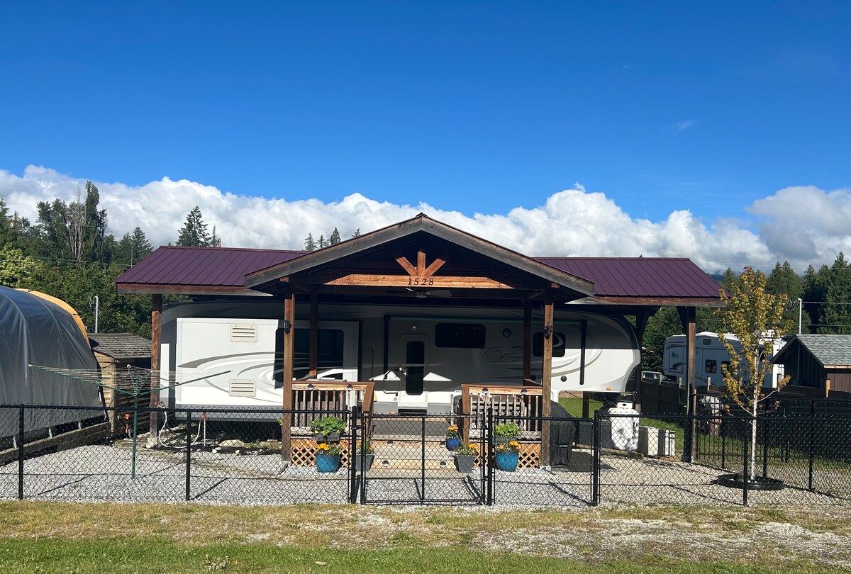 Perfect for a getaway! Bright, warm and cozy, new four season 5th wheel nestled in the mountains. This space is in a private location and has a full kitchen, outdoor kitchen with bar, bathroom with shower, propane furnace, 40" t.v.'s , Netflix, wifi, electric fireplace, covered carport and a big deck. You will also find a custom made wood fired hot tub steps away from the door. Downtown Nelson is a 5 minute drive and 20 minutes to Whitewater Ski Resort.