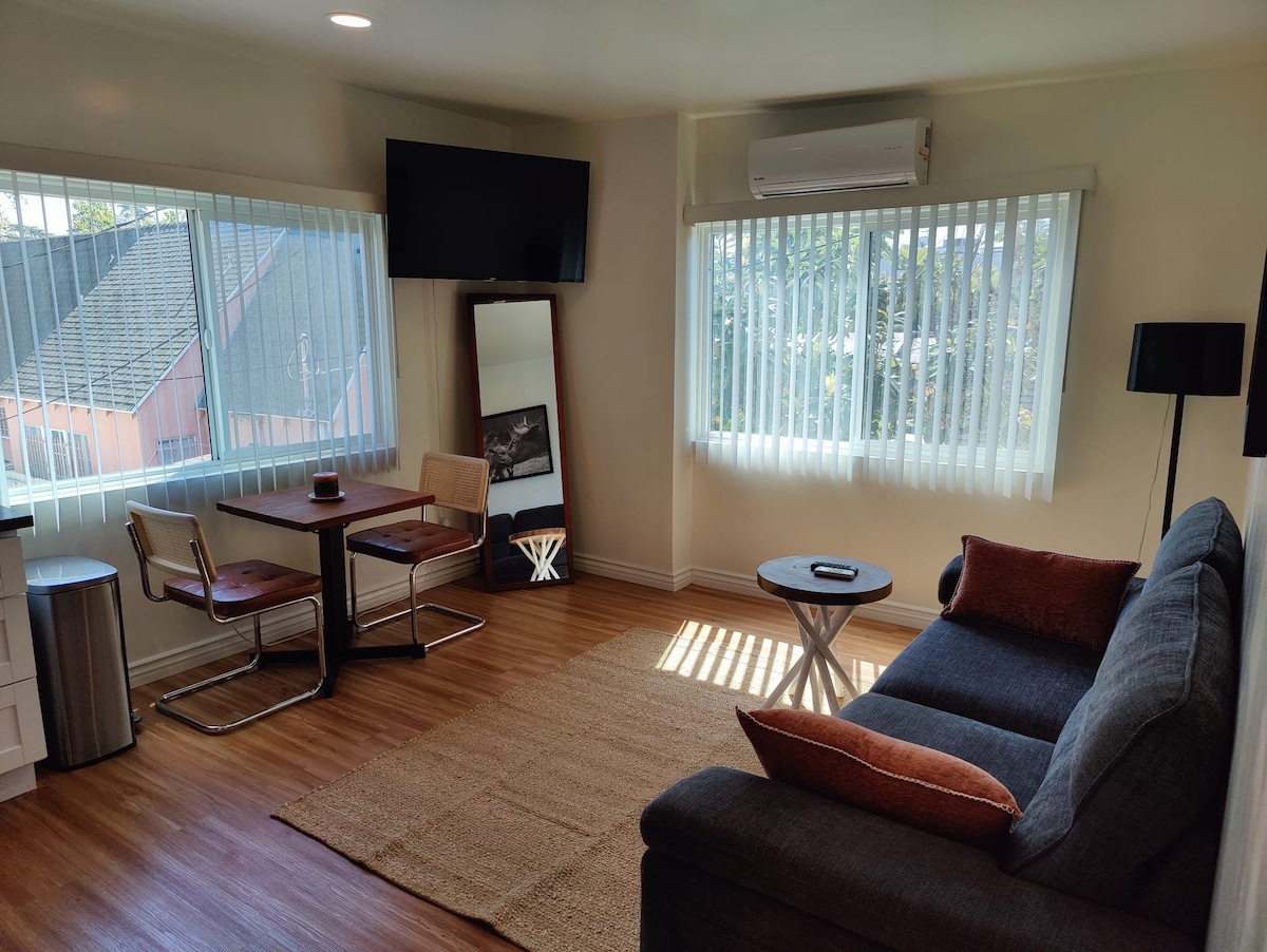 Enjoy comfort and style in this one-bedroom, one-bathroom suite in the heart of Hollywood. This suite offers both luxury and privacy. With bespoke furnishings and fittings, high-end appliances, a luxurious organic bed, high-speed internet, Roku TV, a full kitchen and dining space, a garden patio and a private entrance. Steps away from Sunset and Hollywood Boulevard, Melrose Avenue, and other major Hollywood attractions Plus free parking on premises.