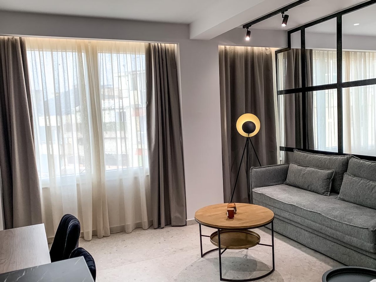 Unique 1 Bedroom fully equipped apartment on the seventh floor of a 2020 renovated building with a breathtaking terrace balcony. High speed internet, premium amenities, a luxurious queen size bed, and your very own Netflix account are but a few things we offer you. Luminous, spacious, with everything you might require to enjoy your stay in the heart of Thessaloniki's social life, only 5 minutes away from Aristotelous square and 2 minutes from the seafront. Welcome and enjoy your stay!