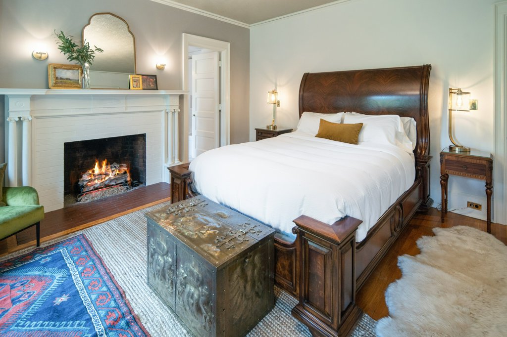 The Bespoke Queen features elegant comfort with a magnificent sleigh bed, gas fireplace, and spa-inspired bathroom with jetted soaking tub. Thoughtfully curated furnishings meet modern convenience with in-room coffee service, mini fridge, plush robes, and luxury fixtures. Enjoy the historic mansion's living room, library, sunroom, gardens, and patio. Moments from the Wine Trail, Cayuga Lake, and Taughannock Falls—the perfect Finger Lakes retreat.